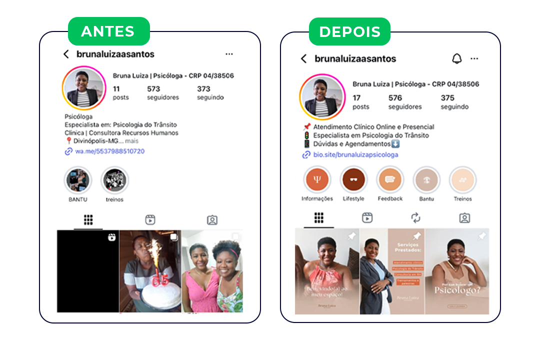 Nós analisamos o seu posicionamento e reconstruímos o seu perfil visual e estruturalmente, entregando uma base sólida para atrair clientes e gerar mais autoridade. Inclui: